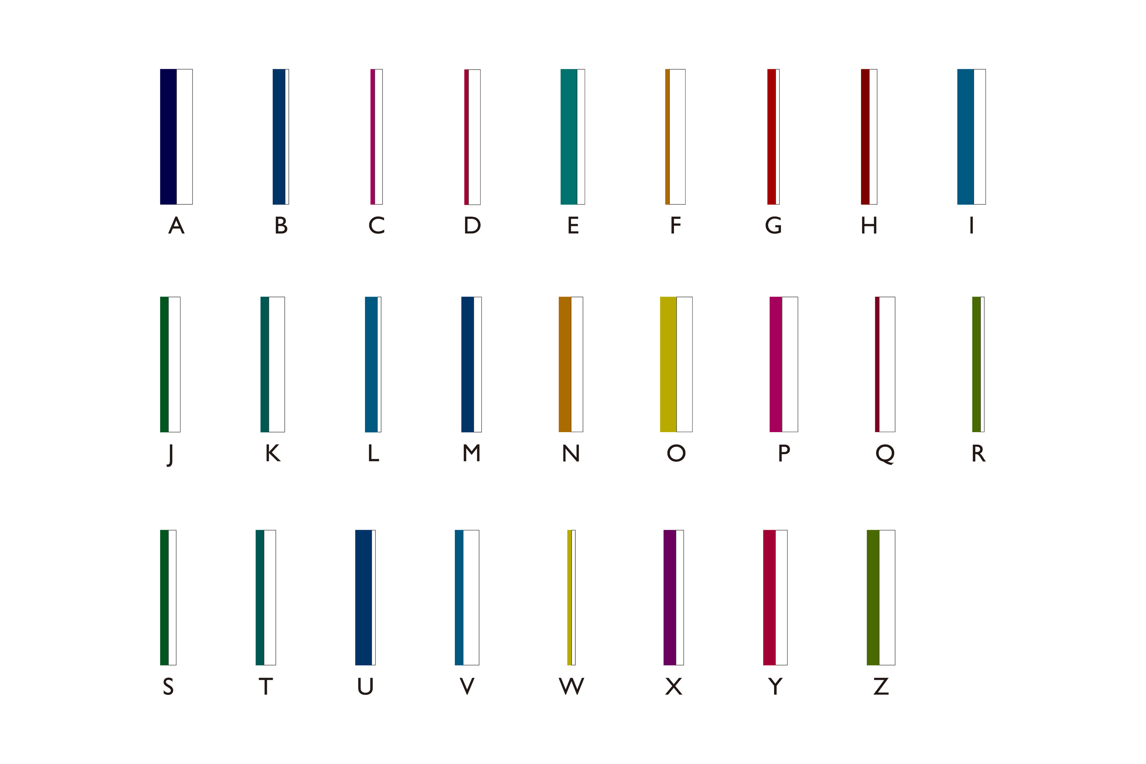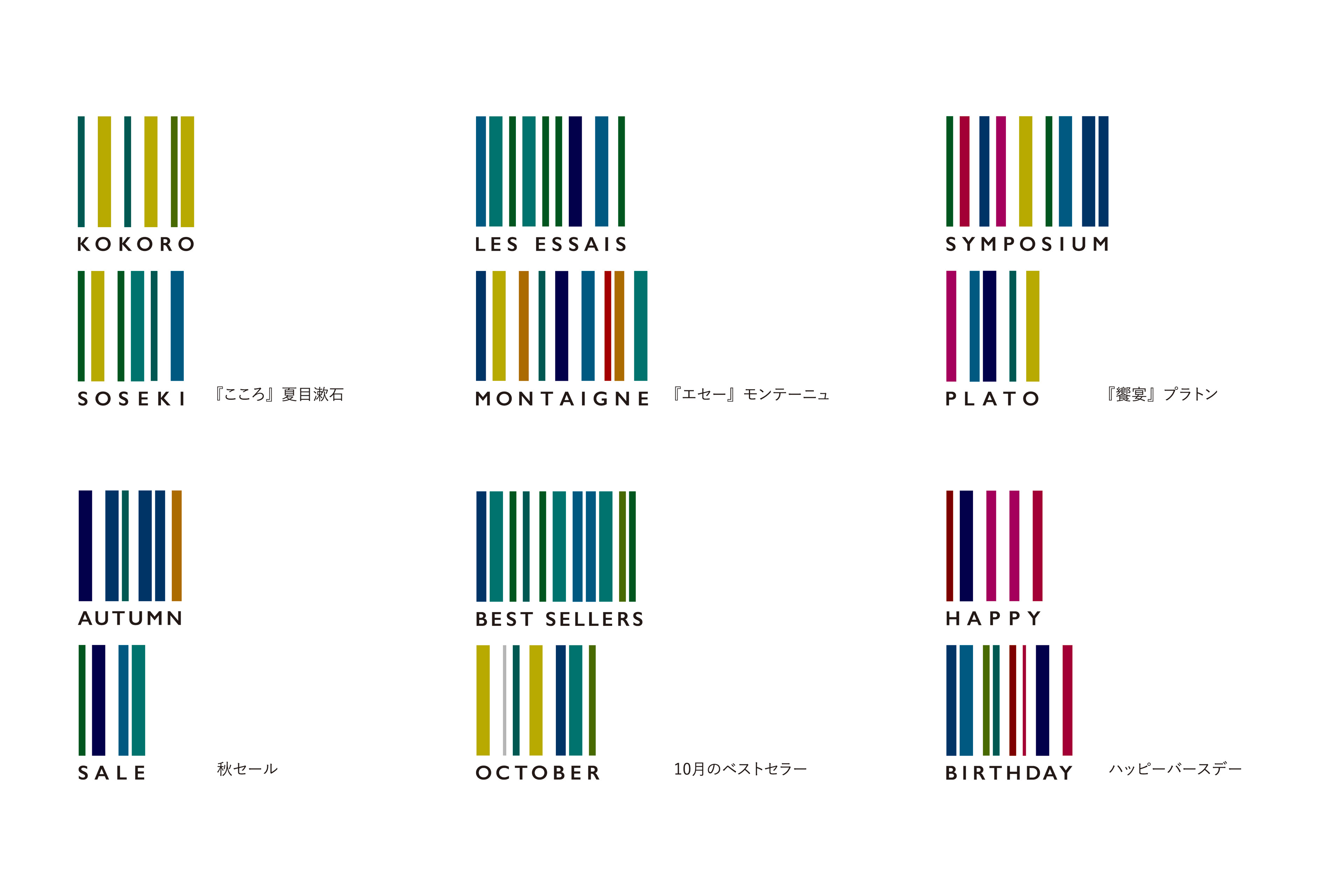 ロゴマークのモチーフは、書籍に特有の「2段バーコード」。俯瞰すると本棚にも見える。JANコードの仕組みを応用し、アルファベット一文字ずつに「色のついたバー」と「白いバー(スペース)」を与えた。